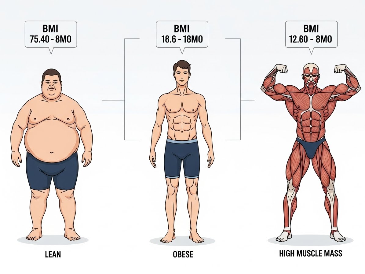 예를 들어, 근육량이 많은 운동선수나 보디빌더는 체지방률이 낮아도 BMI 수치가 높게 나올 수 있습니다. 반대로, 근육량이 매우 적고 지방 비율이 높은 마른 비만의 경우 BMI는 정상으로 나오지만, 건강에는 좋지 않은 상태일 수 있습니다. 이처럼 BMI는 개인의 신체 구성(근육량, 체지방률 등)을 고려하지 못한다는 한계가 명확합니다.