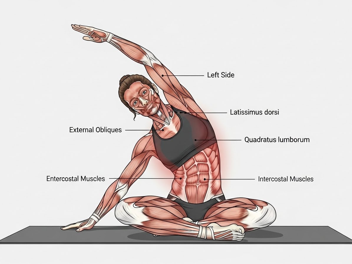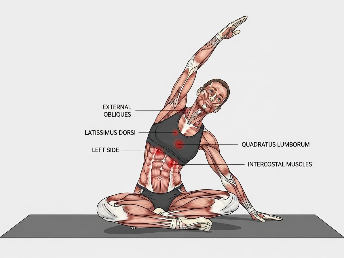 💡 팁: 복부에 가볍게 힘을 주어 허리가 꺾이지 않도록 하고, 옆구리가 늘어나는 느낌에 집중하며 천천히 동작을 수행하세요.